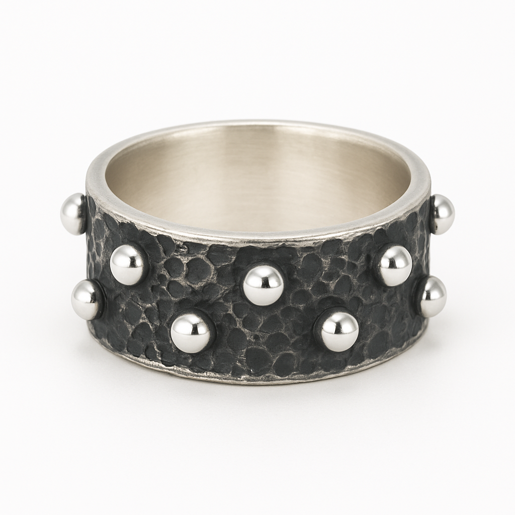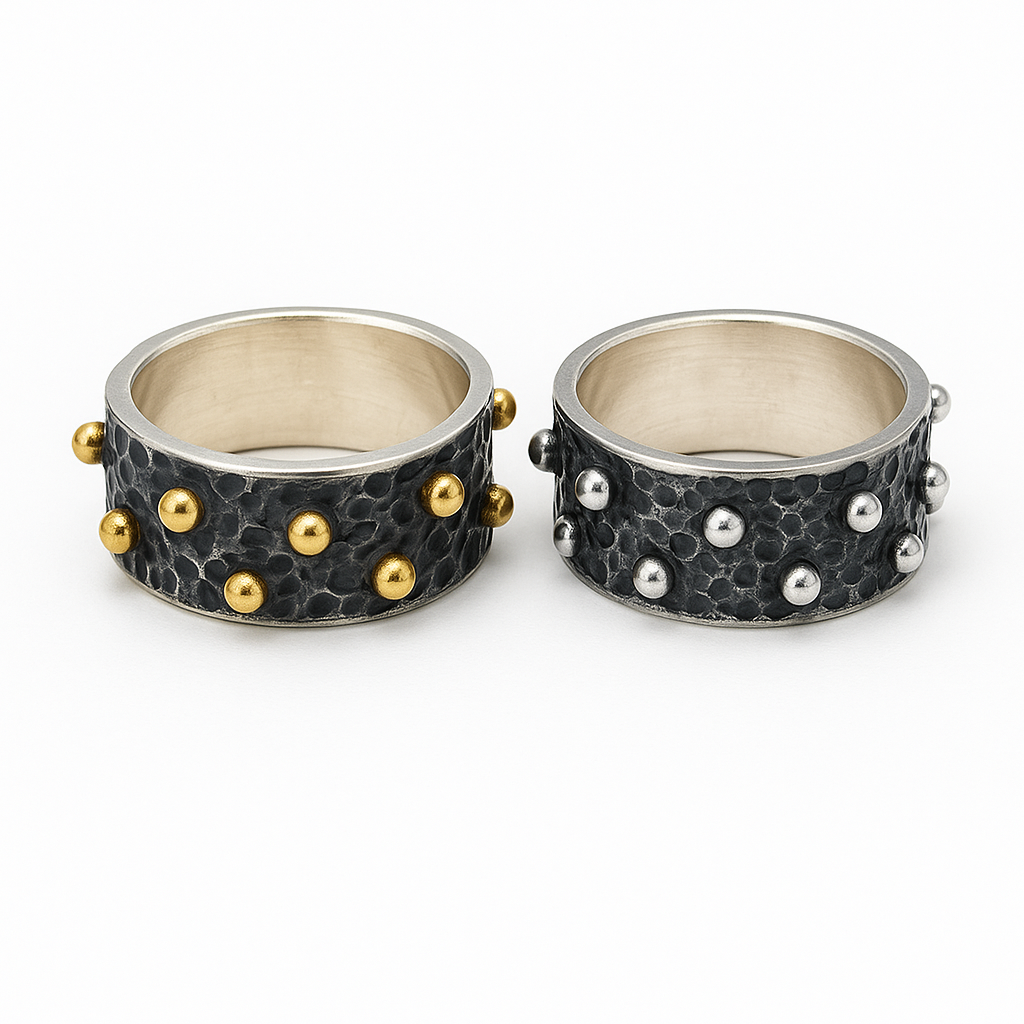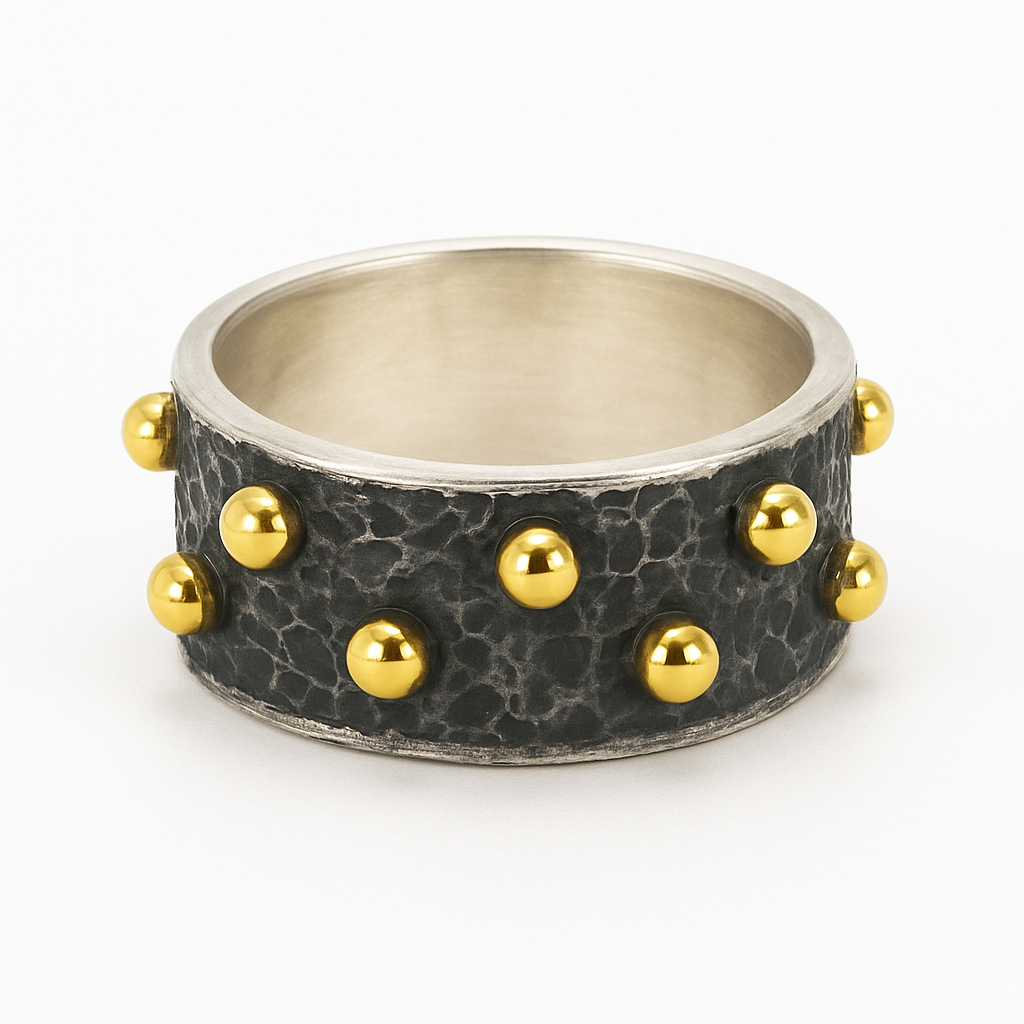 Išskirtinio linksmo dizaino juodinto sidabro žiedas su žvilgančiais burbuliukais. Burbuliukai gali būti sidabriniai balti arba auksuoti.