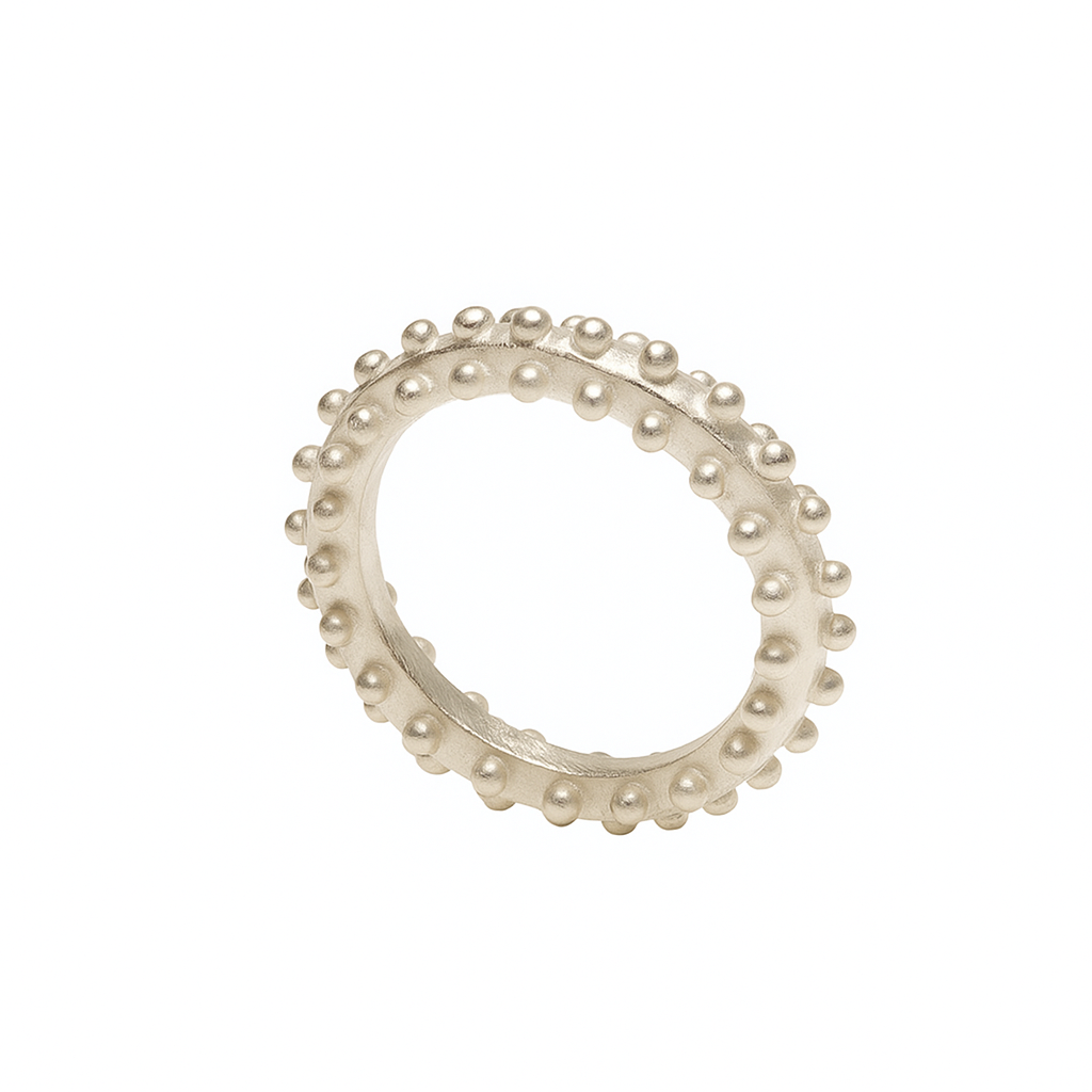 Sidabrinis žiedas su sidabrinių burbuliukų apvadu ant 3 žiedo kraštinių. Linksmas ir modernus.