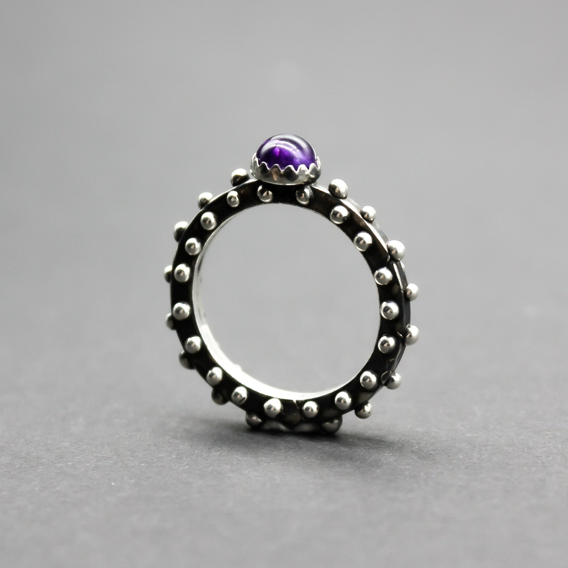 Išskirtinio dizaino juodinto sidabro žiedas su ametistu.